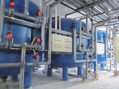 源水先进入调节池调节水质水量,然后由提升泵吸水进入毛发聚集器,对源水中的纤维,毛发等进行截留、去除。然后,加药装置加药,由泵提升到混凝反应沉淀池。水在混凝沉淀池中进行混凝、反应、过滤个阶段,去除水中含有的大部分COD、BOD、SS等,然后进入活性炭过滤器,彻底去除水中残留的污染物质。最后,由二氧化氯发生器对水进行消毒,灭杀各类细菌,达标水储存在清水池内,可用于绿化浇灌,冲厕等用途。