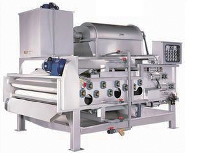 该设备主要由带式浓缩机与脱水机两部分组成,污泥经过投加聚凝剂后,在污泥混合器内进行充分混合反应后流入重力脱水段,在重力的作用下,污泥中的大量游离水从滤带的缝隙中流出,进入集水箱中,然后经楔形预压段导向,使污泥逐渐整平并受到轻度的挤压而进一步脱水,再进入S形多棍压榨区段,污泥被夹在上、下层滤布中间经若干个不同直径的辊筒反复压榨,这时对污泥造成剪切,促使污泥进一步脱水,形成泥饼,最后通过刮刀将泥饼刮落外运,而上、下滤带进行冲洗后重新使用。