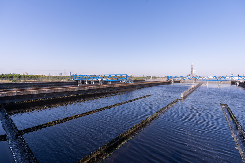 当吸泥机不工作时,即停在进水端;当吸泥机工作时,行车在电气控制的指令下,当顺水流行驶时,先放下撇渣板,刮集浮渣并撇向池端钢制撇渣槽内;反向行驶时,撇渣板提升,离开液面以防浮渣逆行;通过控制电磁阀换向阀,使冲洗水进入钢制撇渣槽内;池底泥水则由吸管(通过虹吸或泵吸)将其排入池边集泥槽内,进行下一步处理,依此作往返工作运动,从而达到吸泥、排泥、撇渣的目的。