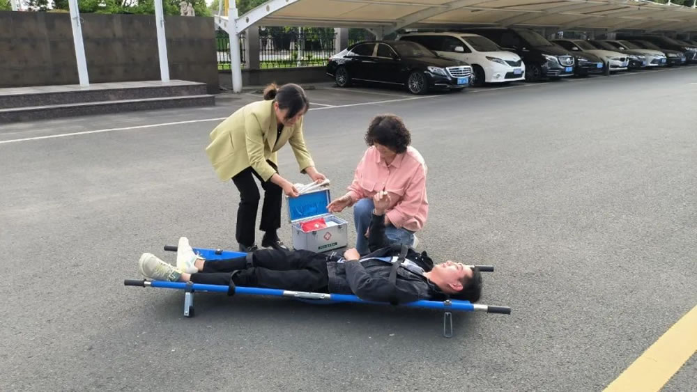 培训结束,消防演练正式开始,总指挥发出启动应急救援预案后,全体人员迅速进入紧急疏散状态,各班组立即进入工作状态:疏散保卫组立即组织大家按照设定的逃生路线,迅速有序地进行紧急疏散,并第一时间撤离到综合大楼正面广场安全区域,各楼层负责人清点本楼层人数;抢险救援组安排专人切断所有电路,就近取灭火器组织灭火,并设立警戒线防止复燃;后勤救护组立即安排专人领取救援设备,对烧伤人员进行转运和包扎,同时联系119和120并安排专人路口等候。